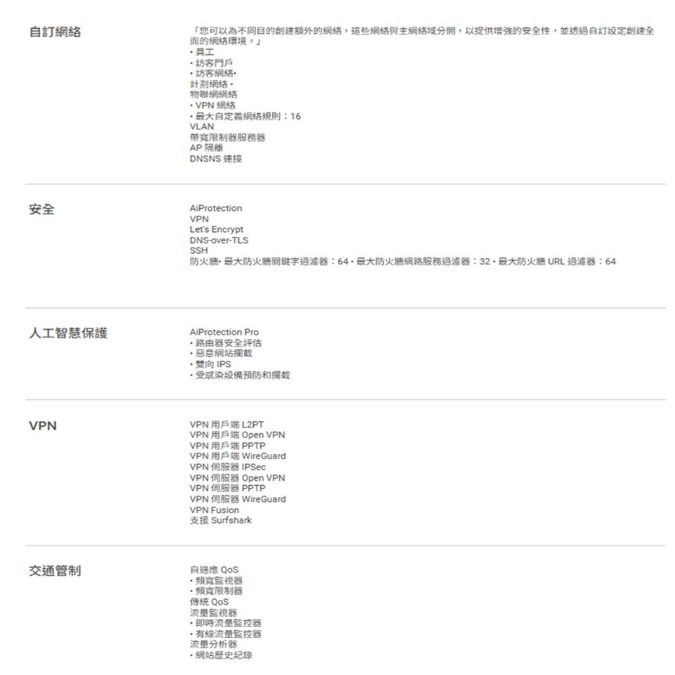 -商業級網路安全和VPN : 透過安全瀏覽和VPN功能保護公共WiFi連線,享受免費訂閱的ASUS AiProtection Pro,包括強大的入侵預防系統(IPS) 功能,如深度封包檢查(DPI)和虛擬修補程式,以封鎖惡意流量。