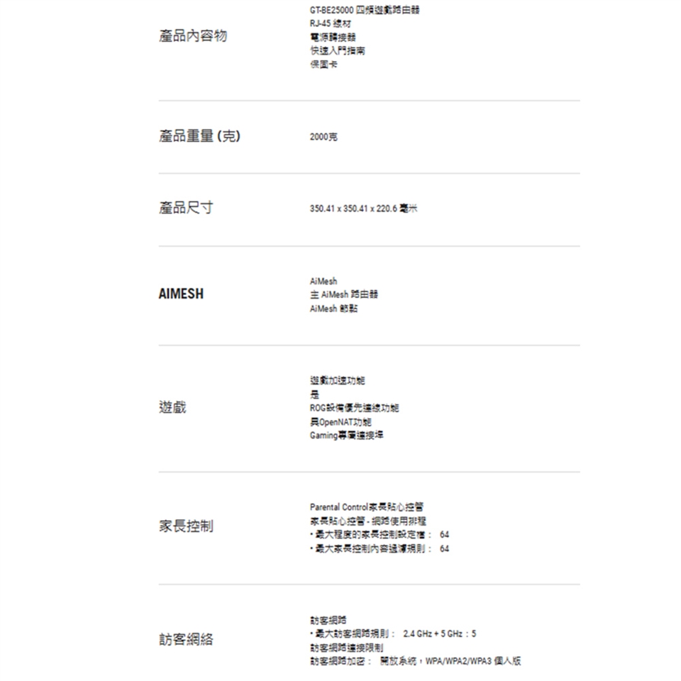 -四頻WiFi 7(802.11be)電競路由器,支援全新320MHz頻寬和4096-QAM、雙 10G連接埠、備用WAN、三層級遊戲加速、手機遊戲模式、AURA RGB、AiMesh支援、無需訂閱的網路安全性和全方位VPN功能。