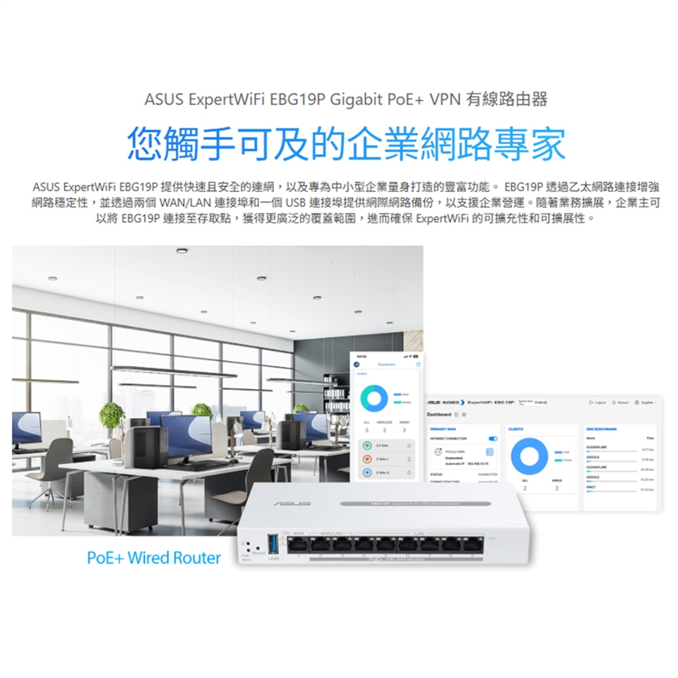 - ASUS ExpertWiFi EBG19P提供快速且安全的連網,以及專為中小型企業量身打造的豐富功能,透過乙太網路連接增強網路穩定性,並透過兩個WAN/LAN連接埠和一個USB連接埠提供網際網路備份,以支援企業營運。