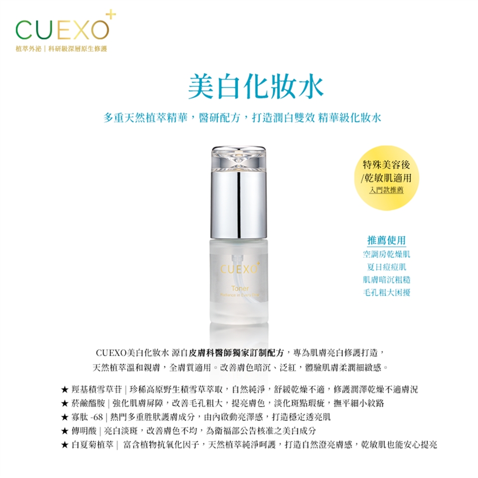 臉部清潔→美白化妝水→CUEXO+植萃外泌精華(日夜皆可使用)→美白乳霜→基礎防曬隔離