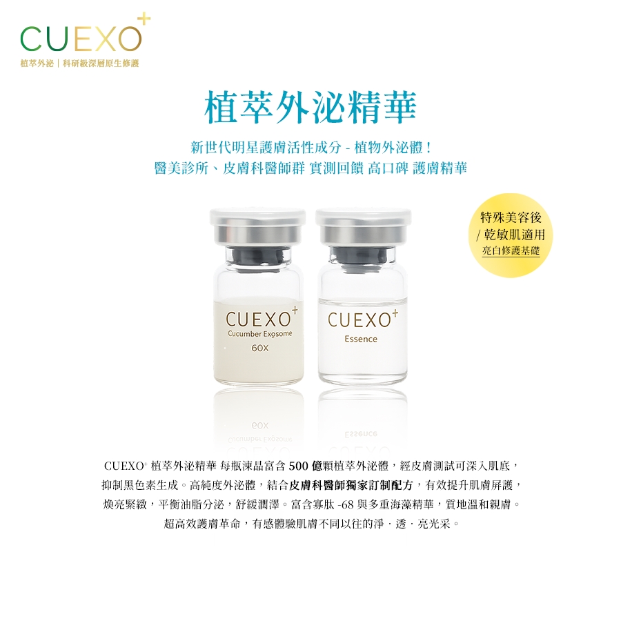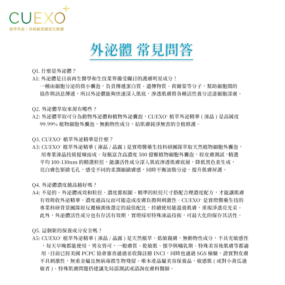 (1) CUEXO+植萃外泌精華為植物細胞外囊泡(涷晶)與晶露混合後的精華液,若呈現微黃至黃褐色屬正常現象,可安心使用。