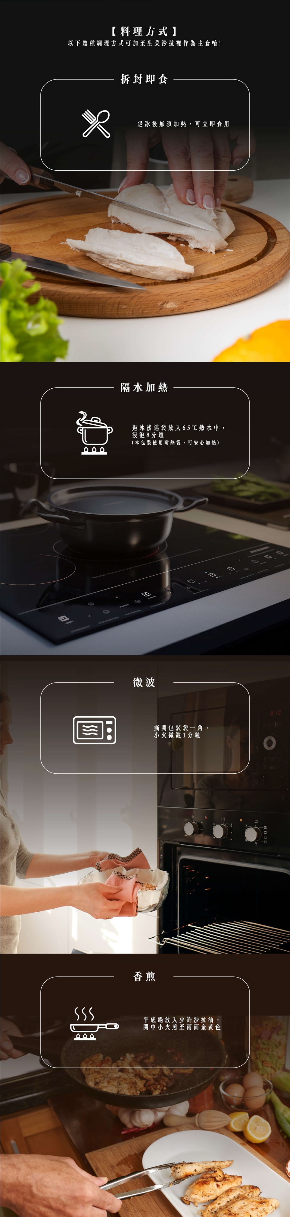 退冰後,拆封即可食用,想吃熱口感可隔水加熱、微波、煎煮即可食用