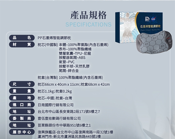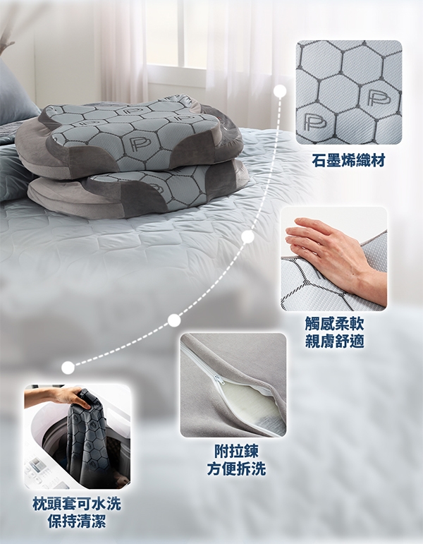 主商品:PP石墨烯智能調節枕*2顆(此商品開放一顆體驗,退貨需歸還,其餘無體驗商品請保持包裝完整,以免退貨產生爭議。)