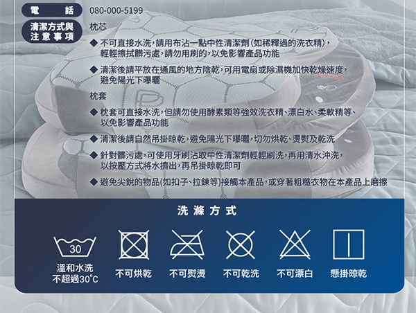 枕套:溫和水洗不超過30度、不可乾洗、不可熨燙、不可漂白、不可烘乾、懸掛晾乾