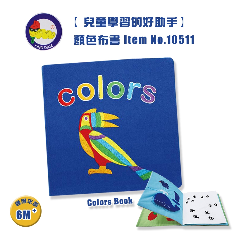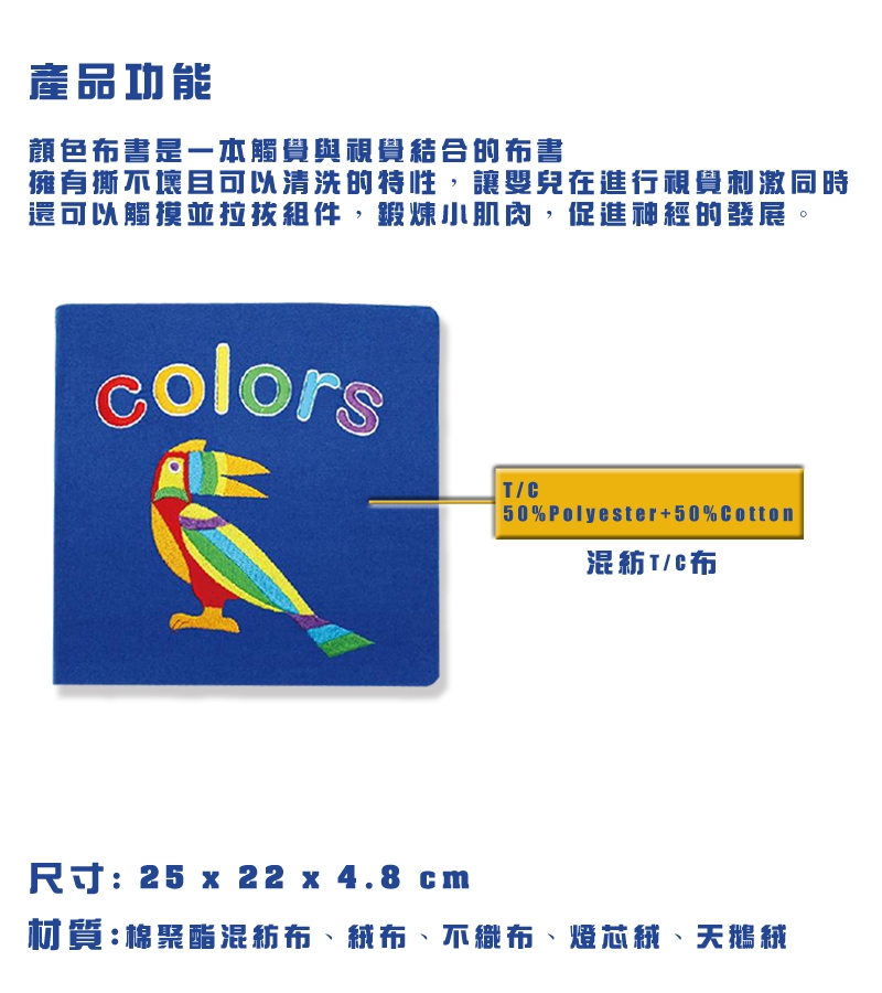 顏色布書是一本觸覺與視覺結合的布書,擁有撕不壞且可以清洗的特性,讓嬰兒在進行視覺刺激同時,還可以觸摸並拉拔組件,鍛煉小肌肉,促進神經的發展。