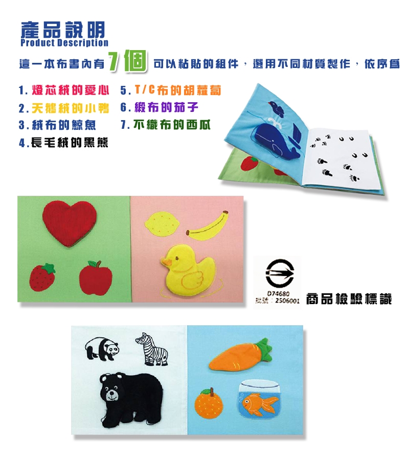 顏色布書是一本觸覺與視覺結合的布書,擁有撕不壞且可清洗的特性,讓幼兒在進行視覺刺激的同時,還可以觸摸並摘拔組件,鍛煉小肌肉,促進神經的發展。