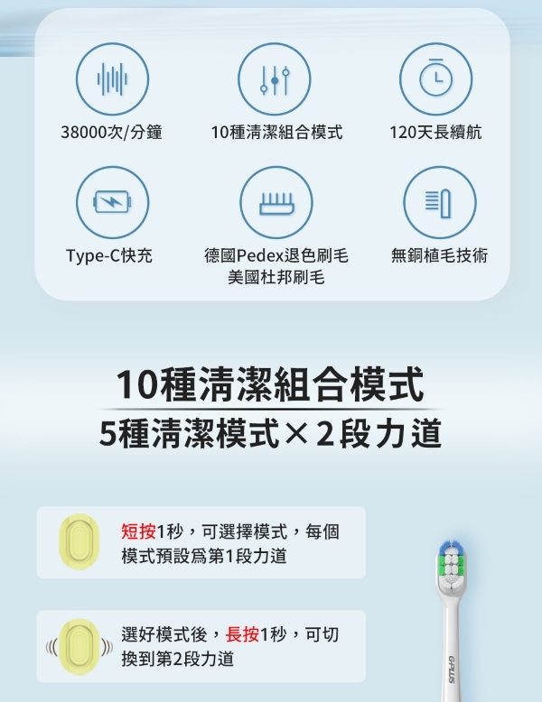 5種刷牙模式、每種模式可切換2段力道