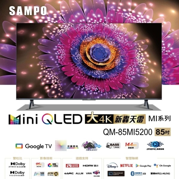 SAMPO 聲寶 85吋 4K MINI QLED轟天雷液晶顯示器 QM-85MI5200