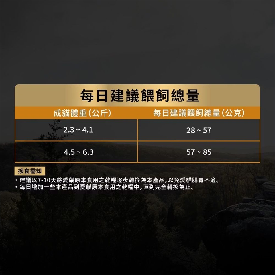 1.本產品建議餵飼量係依照一般成貓平均營養需求所設計。每隻成貓的代謝能力、體重、活動量、年齡、結紮與否等均會影響其每日所需攝食量。若您發現您的愛貓有體重增加或體重減輕之情形,可自行調整餵飼量,以維持理想體態。