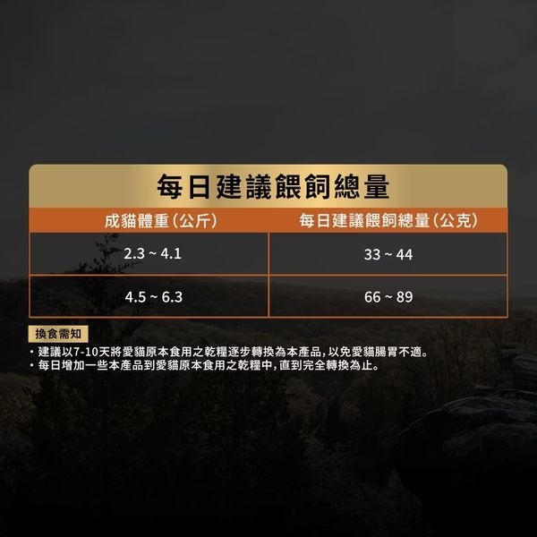 1.本產品建議餵飼量係依照一般成貓平均營養需求所設計。每隻成貓的代謝能力、體重、活動量、年齡、結紮與否等均會影響其每日所需攝食量。若您發現您的愛貓有體重增加或體重減輕之情形,可自行調整餵飼量,以維持理想體態。