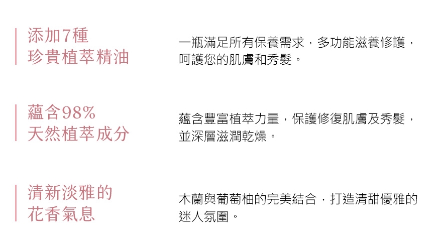深度滋潤,修護臉部、身體和頭髮。