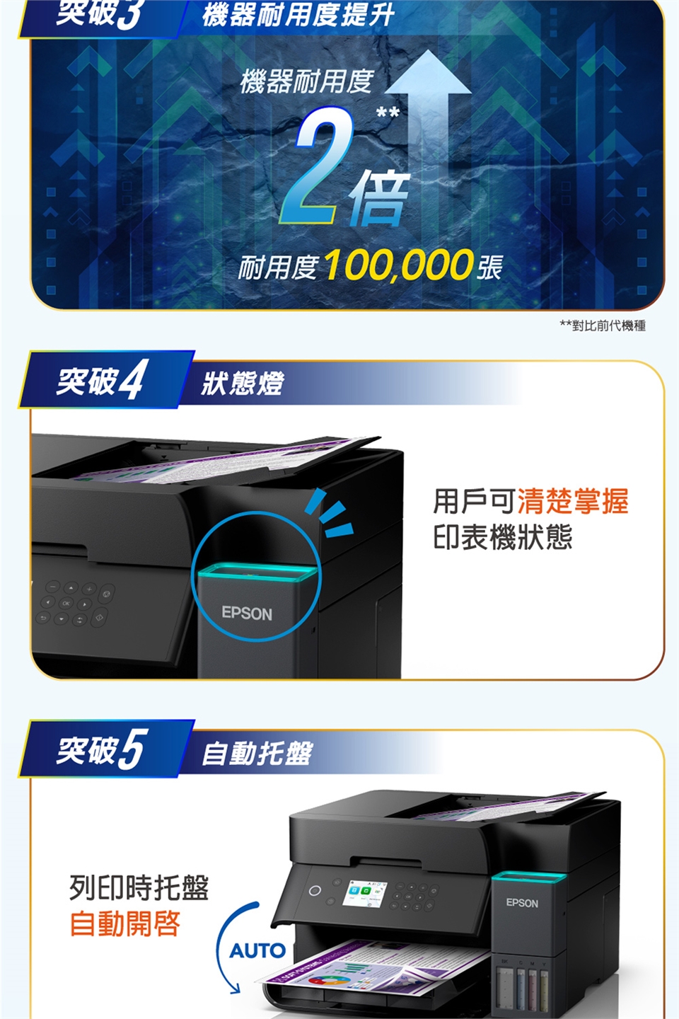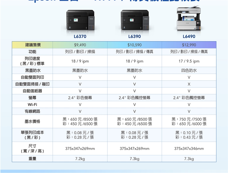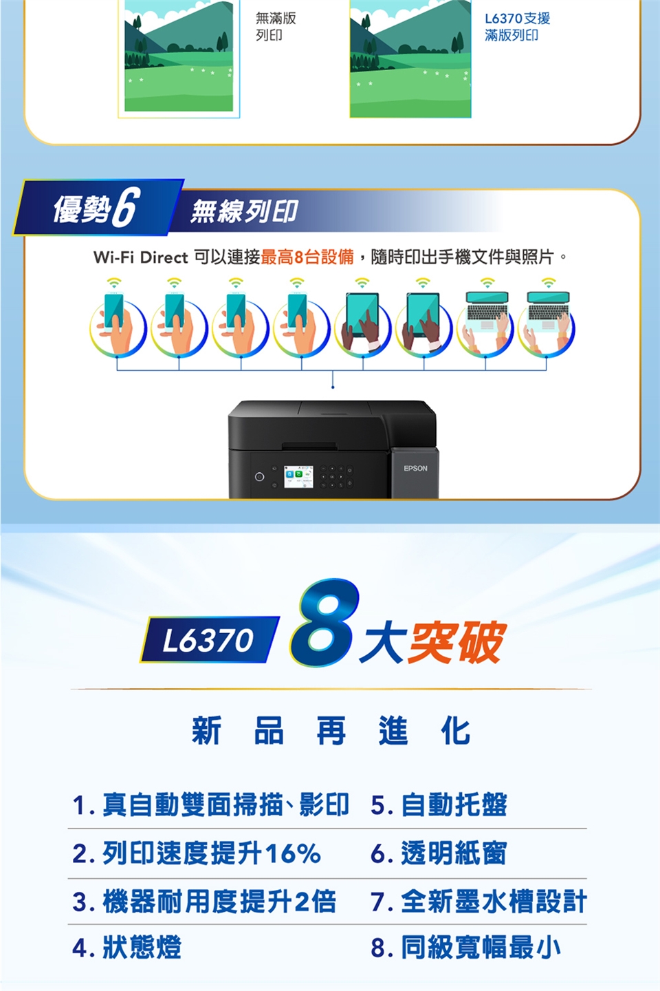 Epson L6370內建全新又便利的自動雙面掃描/影印功能,另搭配防水墨水、自動文件進紙匣,讓您能有效進行多頁/雙面處理,不僅環保更節省寶貴時間。
