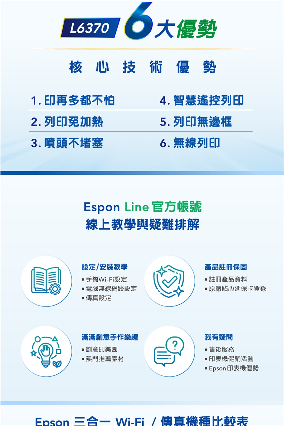 Epson L6370內建 Wi-Fi 無線區域網路,同時支援 Wi-Fi Direct 模式,只需安裝一次驅動程式,即能在不同房間、樓層進行列印,且可多人協作共享,超越空間限制、一指切換列印模式,不僅簡化設定流程,更增進列印效率。