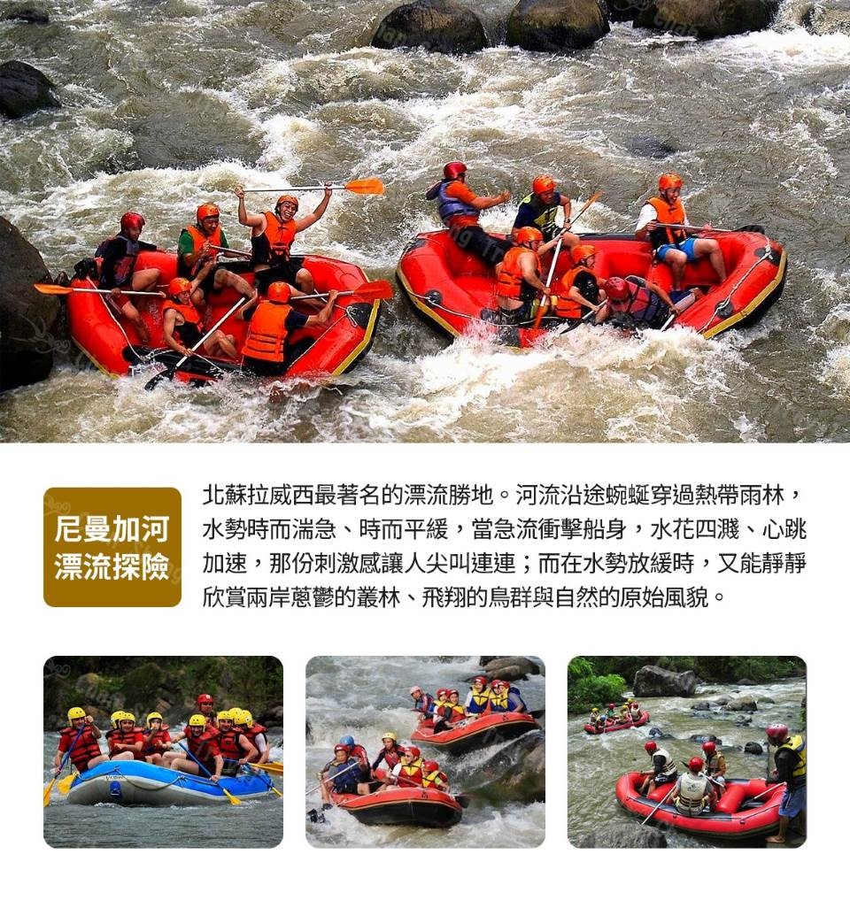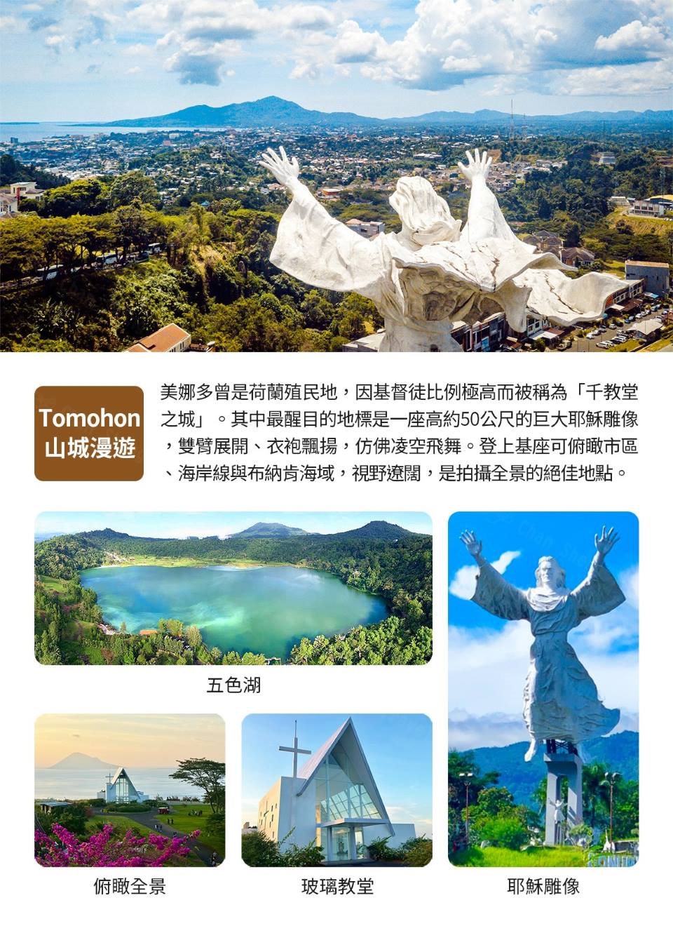 🌿【Nimanga River 漂流探險】(車程約 1.5 小時) 早餐後離開海岸,驅車深入山區,沿途山坡綠意盎然、村落靜謐,空氣格外清新抵達 Nimanga 溪流,這裡水流時而湍急、時而平緩,非常適合漂流探險。 換上裝備後,搭乘橡皮艇沿溪而下,全程約 1.5 小時,沿途有歡笑、有潑水,陽光透過樹葉灑在水面上閃閃發亮,兩岸覆滿藤蔓與熱帶植物,伴隨鳥鳴聲,彷彿置身大自然的懷抱展開一場冒險。 🔆 小提醒:建議穿著快乾衣物並攜帶換洗衣服,行程結束後能舒適乾爽地繼續山城漫遊。 ✝️【耶穌雕像 – 千教堂之城的地標】 (車程約 20 分鐘) 美娜多曾是荷蘭殖民地,當地基督徒比例極高,被稱作「千教堂之城」。這座高約 50 公尺的巨大耶穌雕像矗立在山坡上,雙臂展開、衣袍飄揚,仿佛凌空飛舞。登上基座可俯瞰整個美娜多市區、海岸線與遠方的布納肯海域,視野遼闊,是拍攝全景照的絕佳地點。 ☕【五色湖 & 山城下午茶】 (車程約 20 分鐘) 五色湖是 Tomohon 的火山湖,湖面寬闊,四周被青翠山巒環繞,景色寧靜悠然。湖邊空氣帶著淡淡硫磺氣息,散步拍照都別有一番風味。特別安排在湖畔咖啡廳享用下午茶,一邊品嚐當地咖啡或甜點,一邊眺望遠山與湖景,感受山城午後的悠閒時光。 ⛪【 美娜多全景+玻璃教堂】(車程約 20 分鐘) 接著前往視野極佳的觀景點,俯瞰整個美娜多市區,山海交織的壯麗景致一覽無遺,遠方 Bunaken 海域也清晰可見。觀景平台旁的玻璃教堂以現代簡約風設計,大片落地窗灑入陽光,教堂本身宛如藝術品。這裡是夢幻婚禮的熱門場地,也吸引許多攝影團隊來取景。坐在教堂內或庭院中,看著陽光和微風交織,彷彿置身一場浪漫電影場景,既適合沉澱心情,也非常適合拍下美照留念。 早餐:飯店享用 午餐:火山花園餐廳2 晚餐:美娜多海盜海鮮風味餐廳 |