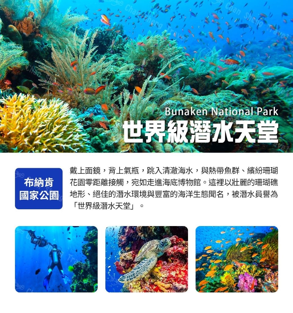 【 布納肯海域深潛行程 】 早餐:飯店享用 午餐:島上簡餐 晚餐:NDC風味餐 |