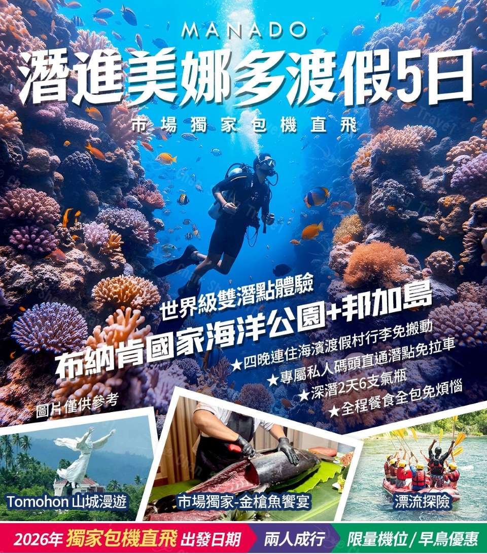 今日集合於桃園國際機場,搭乘空中巴士客機直飛前往印尼【Manado 美娜多】,展開北蘇拉威西潛水專屬五天四夜行程。 【印尼北蘇拉威西的潛水天堂 – Manado 美娜多】想像一座面海靠山的城市:清晨陽光灑落在碧藍海面,午後微風吹拂自火山高地,夜晚滿天星斗伴隨海浪聲,彷彿走進一幅熱帶明信片。Manado 與 Bunaken 海洋國家公園 是世界級潛水點,以其清透海水、高能見度(常見 20–35 公尺)、 豐富珊瑚牆牆潛(wall diving)、垂直峭壁與多樣魚類生物聞名。這裡不只是初學者的天堂,也能滿足資深潛水者對大魚、軟珊瑚、攝影與生態多樣性的追求。 【 抵達與入住 NDC Spa & Resort 】(車程約 40 分鐘) 抵達後專車接送,入住 NDC Spa & Resort。這裡臨海設有私人碼頭,從渡假村即可出海,專為潛水客設計,省去舟車疲憊,是潛水行程的完美出發點。房間寬敞、環境寧靜,是放鬆與調整時差理想下榻地。 早餐:XXX 午餐:機上餐 晚餐:金槍魚迎賓宴 |