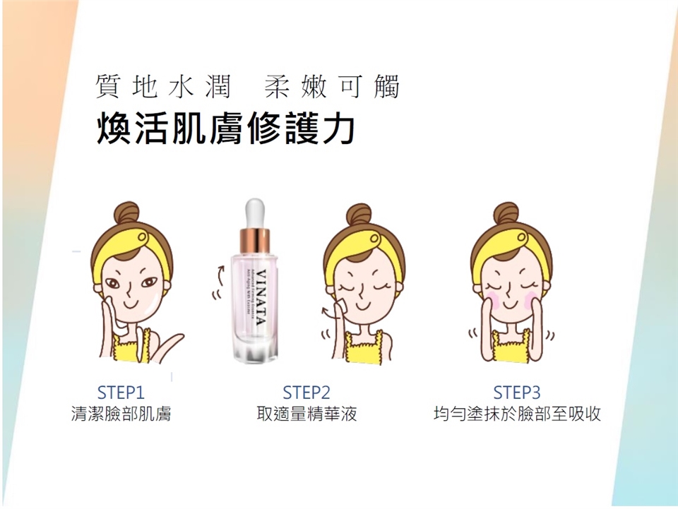 清潔臉部化妝水後,取適量輕拍全臉至吸收,可加強欲改善處的用量,適度加強按摩拉提。