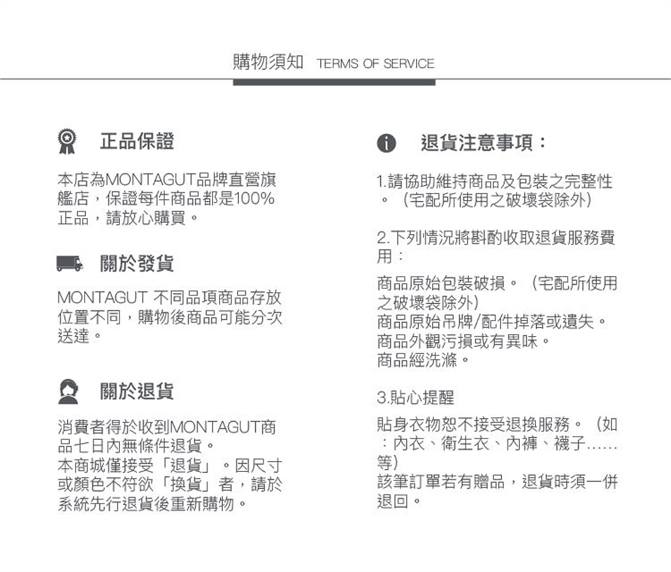 退換貨限制:鑑賞期間內,商品須維持完整及無髒汙方可退貨退貨。除商品本身有瑕疵,染色牢度差、車縫不良、髒汙、破損)或尺寸不符可退換貨外,若吊牌一經毀損、拆除或衣服經洗滌後即不可退換貨。