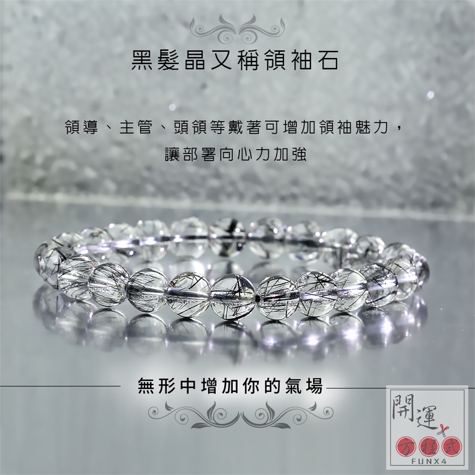 黑髮晶是發晶中的一種,其內含物為黑色針狀或髮狀物質,多數為黑色電氣石。黑髮晶又稱領袖石,領導、主管、頭領等戴著可增加領袖魅力,讓部署向心力加強,有助於事業成功。而且黑色的發晶看起來很有酷酷的,充滿了現代感!佩戴起來可以無形中增加你的氣場。