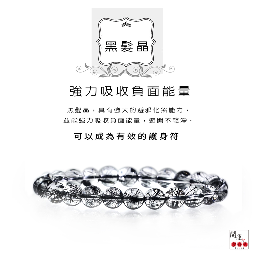 黑髮晶和黑曜石同為消除負性能量著稱,具有強大的避邪化煞能力,並能強力吸收負面能量,避開不乾淨的東東。人們認為黑髮晶具有避邪的功效,可以成為有效的護身符,防巫咒,黑法術等。黑髮晶具有強大能量,可加強氣勢,以消除負性能量著稱,佩戴可以消除身上不良濁氣,例如生病、出入複雜的場所、醫院甚至常常需要夜出的朋友,都可以有效的防止不良磁場的干擾。對常常用腦過度的上班族或創意工作者來說佩戴黑髮晶有很好的平衡作用。