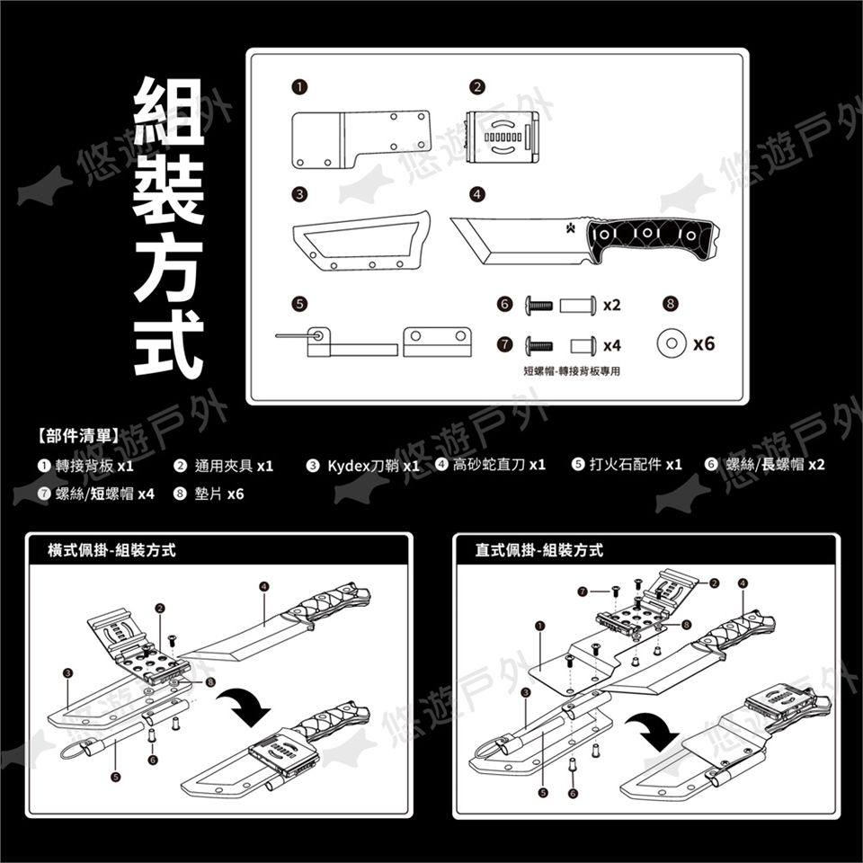 ・材質:日本製造AUS8不鏽鋼、G10刀柄、Kydex刀鞘、安全塑膠扣、304不鏽鋼螺絲