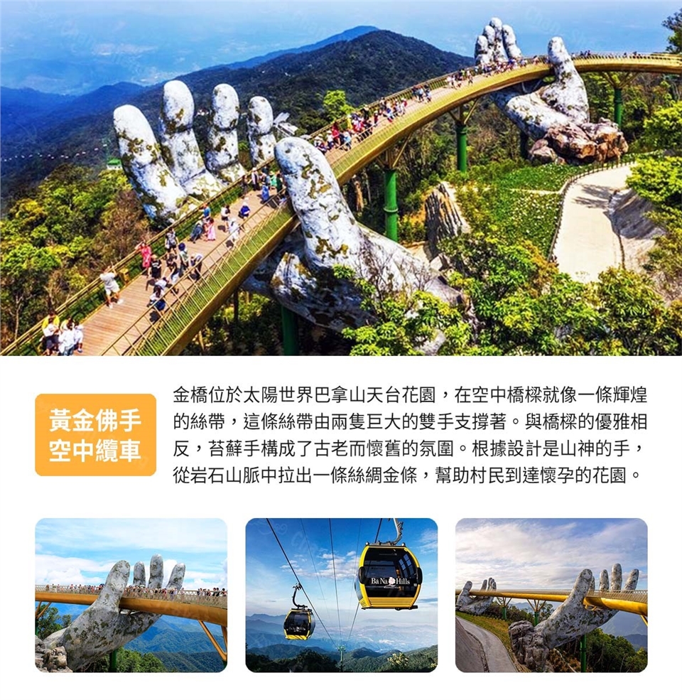 巴拿山上有一座特別的金色橋樑,從遠處乍看宛若峴港上空雲層裡的一條絲帶。撐起「黃金橋」的巨大雙手布滿青苔,風化效果營造出歲月和蒼桑的美學之感。巨手托捧著金色橋身,聳立海拔約1400公尺的雲霧之上,更帶有一點禪意,天氣晴朗時,視野一望無際,當大霧時,橋就像浮在雲海之中,另有一番淒美意境。 早餐:飯店享用 午餐:巴拿山自助餐 晚餐:峴港海鮮料理<含酒水> |