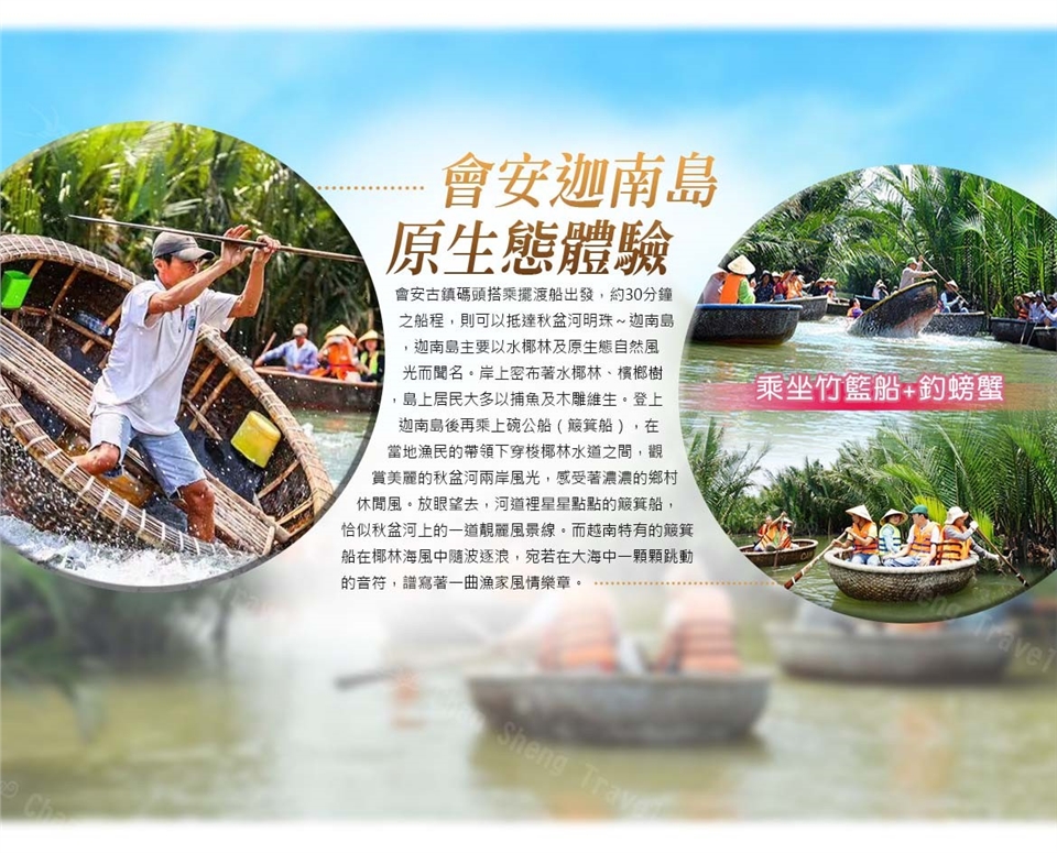【迦南島原生態體驗】迦南島主要以水椰林及原生態自然風光而聞名。岸上密布著水椰林、檳榔樹,島上居民大多以捕魚及木雕維生。登上迦南島後再乘上碗公船(簸箕船),在當地漁民的帶領下穿梭椰林水道之間,觀賞美麗的秋盆河兩岸風光,感受著濃濃的鄉村休閒風。放眼望去,河道裡星星點點的簸箕船,恰似秋盆河上的一道靚麗風景線。而越南特有的簸箕船在椰林海風中隨波逐浪,宛若在大海中一顆顆跳動的音符,譜寫著一曲漁家風情樂章。漁民們之中會有一位技藝高超的漁夫獨自划船出來,開始在簸箕船上表演精彩絕技,只見漁夫將圓圓的簸箕船操控自如,將碗公船舞弄的旋轉翻飛,之後會挑選膽子大的旅人還可以一起參與表演,當漁夫將簸箕船劃得高速旋轉,上下左右翻騰,而遊客在船中則緊緊抓住船架,尖叫不已,刺激萬分,高超的技藝更是令遊客們的喝彩聲和掌聲不絕於耳。隨後漁夫拿出自製的天然釣竿繫上螃蟹愛吃的餌,體驗當地人家於椰林中釣螃蟹的樂趣。 早餐:飯店享用 午餐:BELLERIVE飯店內用海鮮火鍋+每人螃蟹一隻 晚餐:HOME精緻越式料理<含酒水> |