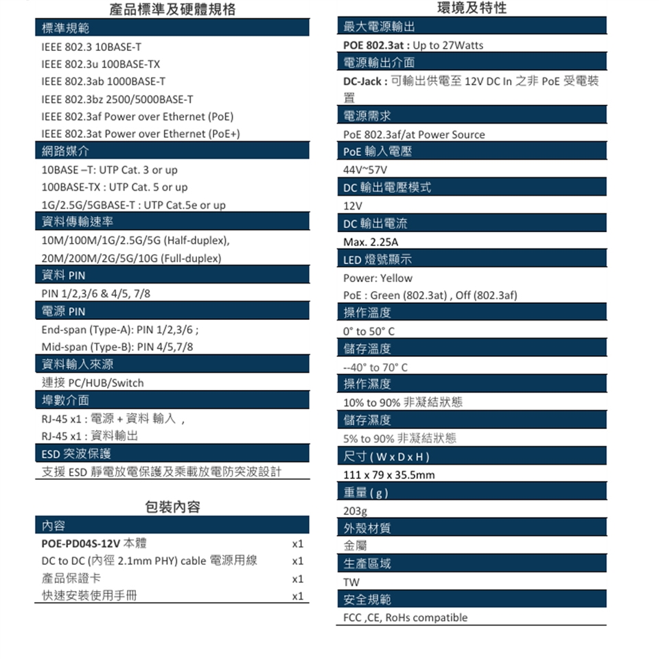 -符合 IEEE 802.3 10Base-T, IEEE 802.3u 100Base-TX, IEEE 802.3ab 1000Base-T, IEEE 802.3bz 2500 /5000 BASE-T, IEEE 802.3af/at PoE等標準規範。
