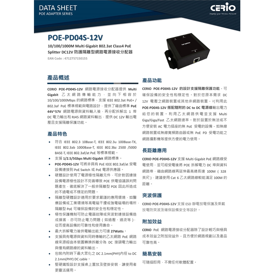 -POE-PD04S-12V 可將非具有PoE IEEE 802.3af/at受電設備連接到PoE Switch或PoE 電源供應器。