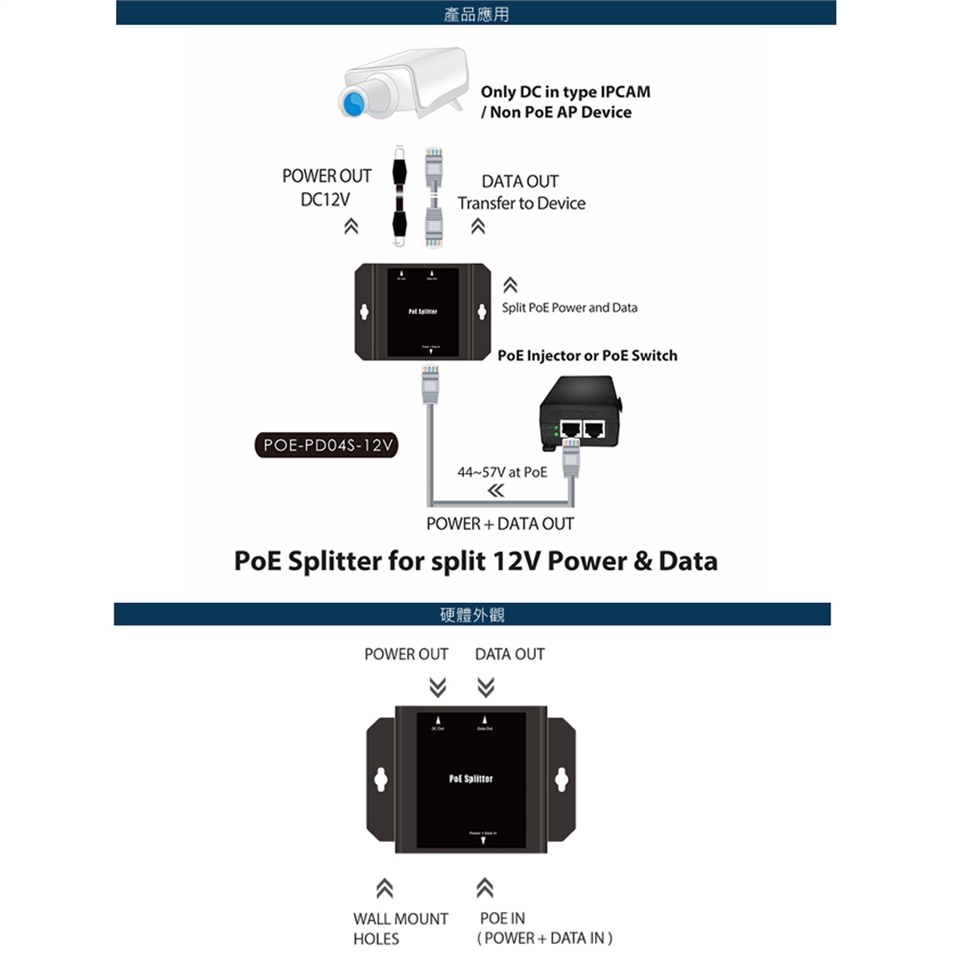 -支援具有電源與資料同時傳輸的乙太網路PoE網路線來源經由本裝置轉換拆離分為DC 接頭電力輸出與僅有網路線的資料輸出。
