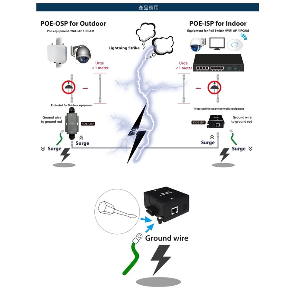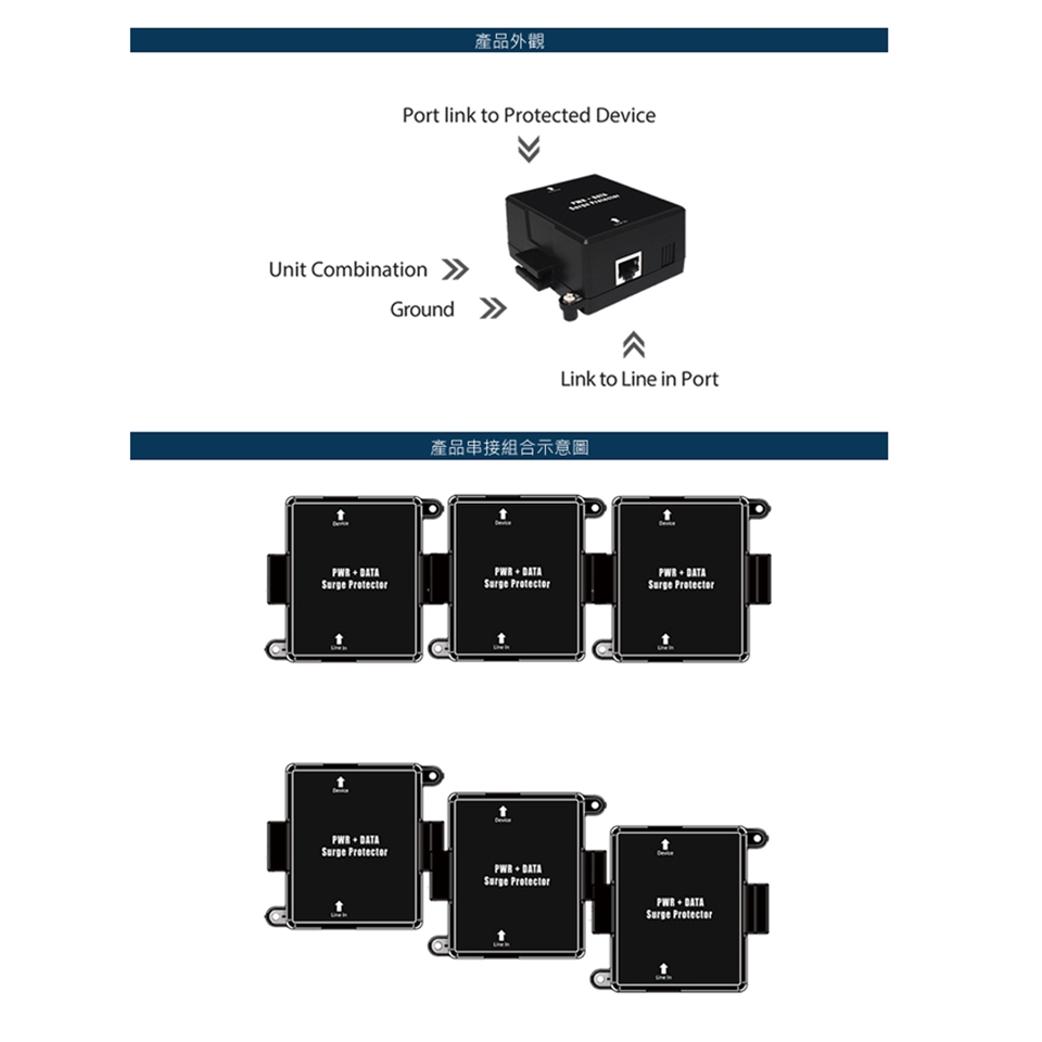 -內建金屬接地功能外部螺絲方便連接接地線,降低箝位電壓,確實接地後最高具有10 kA 脈衝放電電流等能力,輕易完成可靠的突波保護。