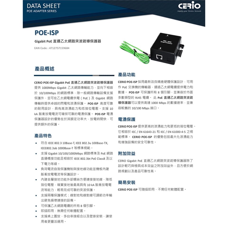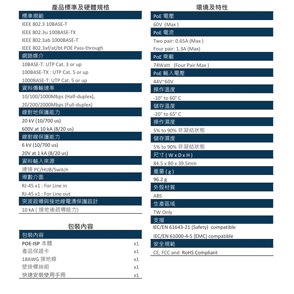 -支援Gigabit 10/100/1000Mbps 網路標準及PoE 網路直通橋接功能且相容於IEEE 802.3bt PoE Class8 及以下電力等級。