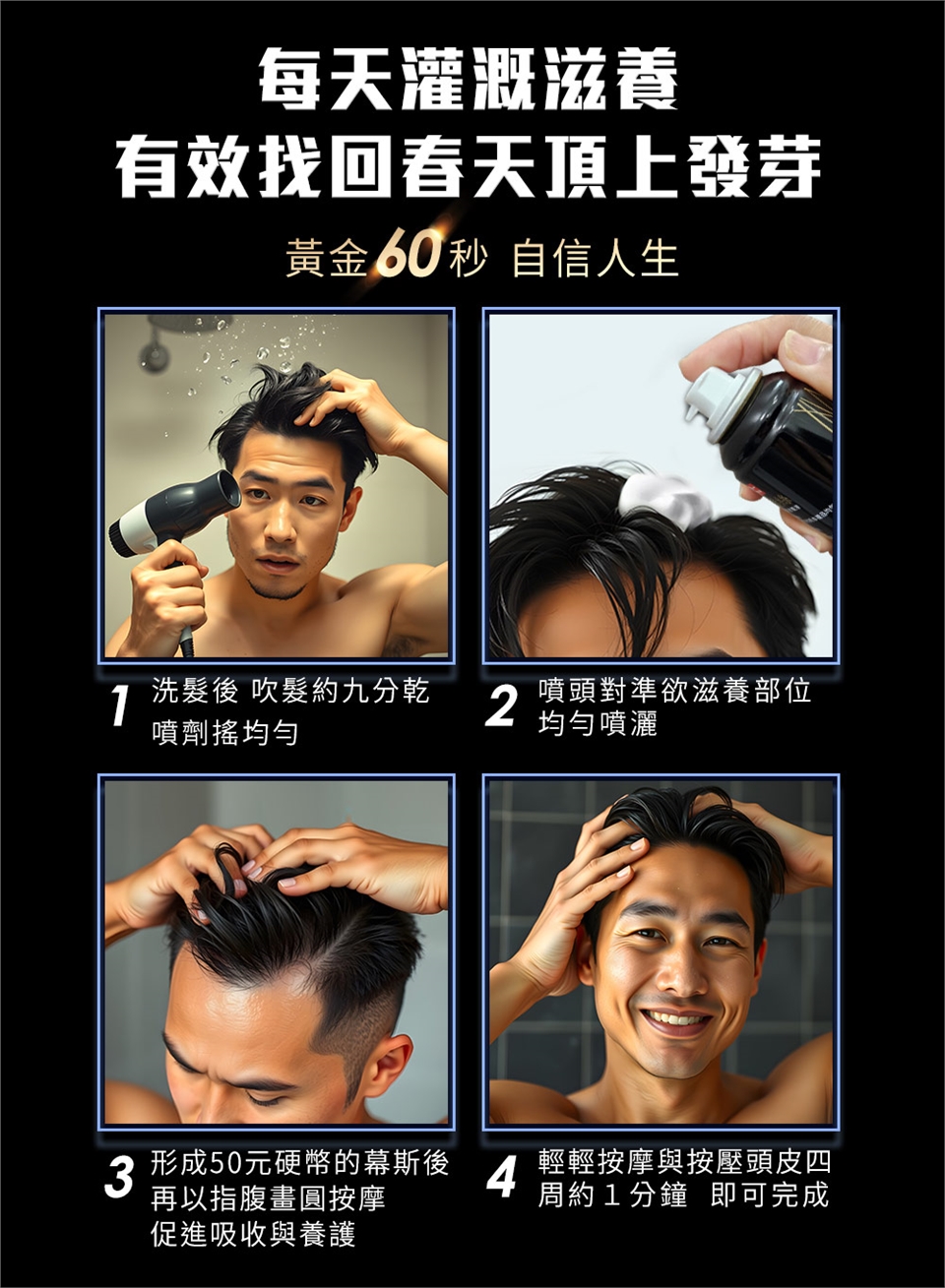 ◆使用方法: 建議每日早晚各使用一次,使用前先搖勻後均勻噴於頭皮,以手指輕輕按摩免沖洗。
