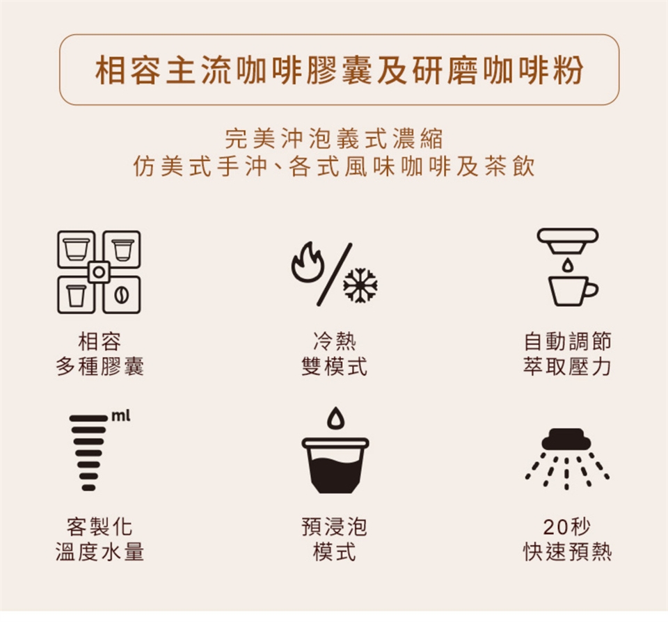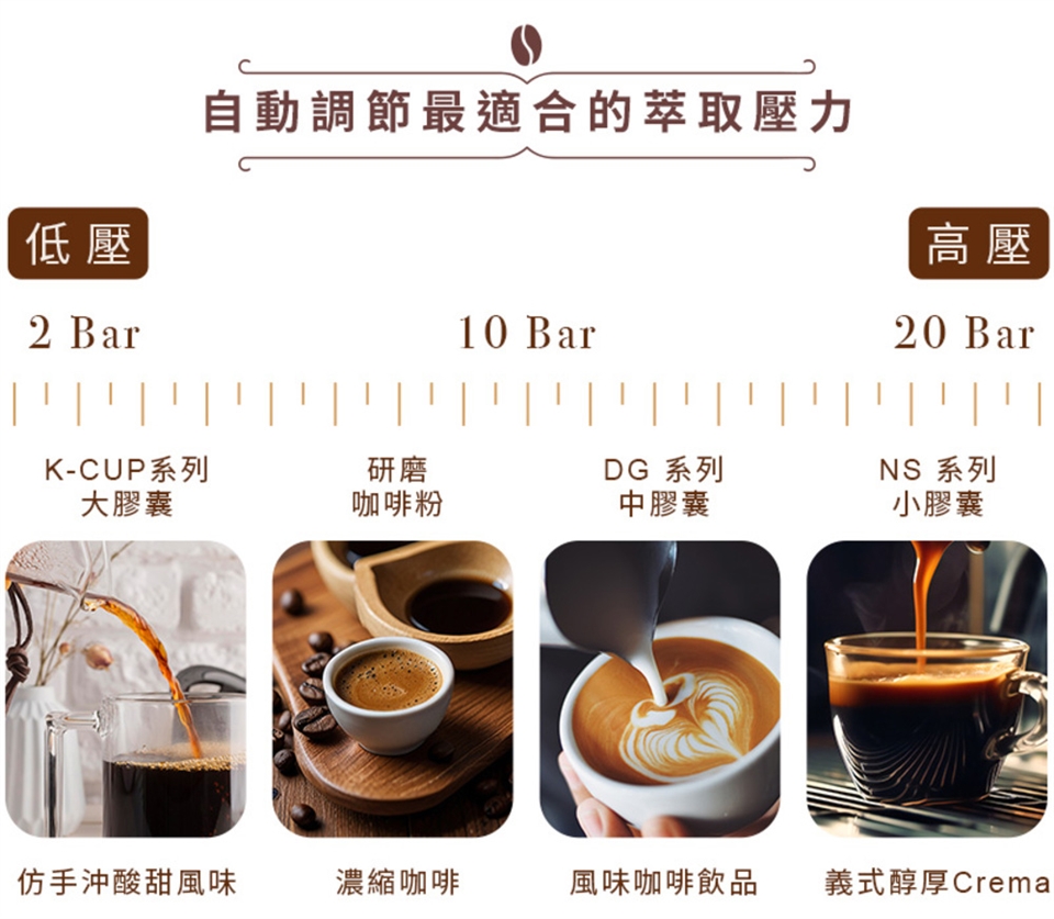 透過不同膠囊及咖啡粉的顆粒粗細,自動調節萃取壓力,不只能以 20Bar 高壓萃取出義式醇厚的黃金 Crema,還能以 2 Bar 低壓沖泡出仿手沖的美式酸甜風味
