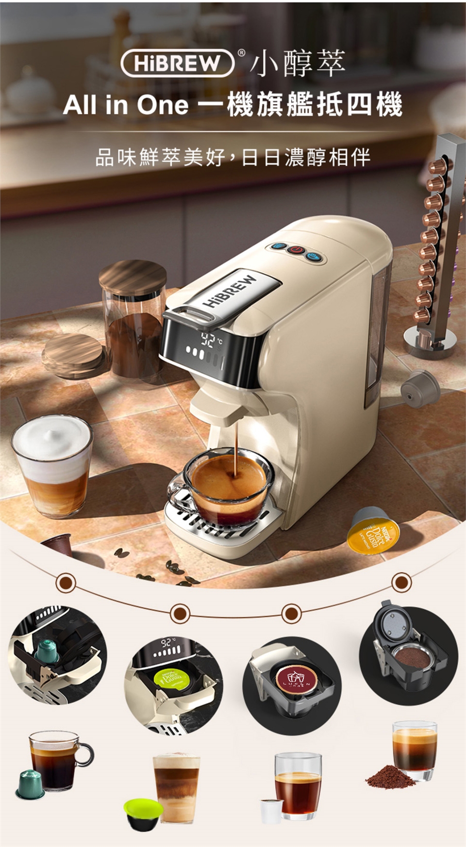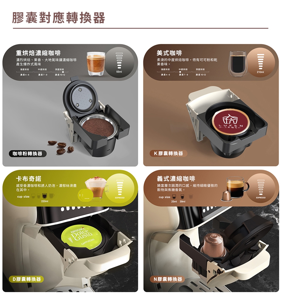 除了能相容市面主流膠囊咖啡 — NESPRESSO Original 系列膠囊、 NESCAFE Dolce Gusto 膠囊、K-cup 膠囊,還能自行填入喜歡的咖啡粉。咖啡機的選擇不再受膠囊限制!