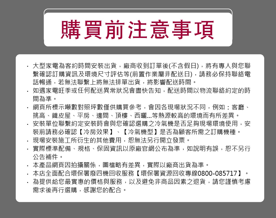 安裝單位聯繫約定安裝時會與您確認選購之冷氣機是否足夠現場環境使用安 裝前請務必確認【冷房效果】 【冷氣機型】是否為顧客所需之訂購機種。 現場安裝施工所衍生的其他費用恕無法另行開立發票。 實際標準配備、規格、保固資訊以原廠官網公布為準,如說明有誤,恕不另行