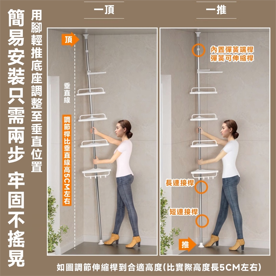 ④高低兩用/擎天式收納,使用範圍(175cm-230cm)(2.45cm-300cm)墻角/洗漱台都可使用