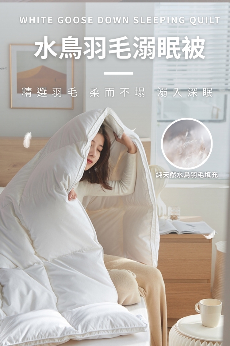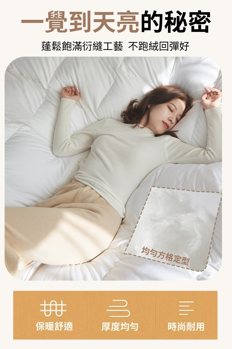 *定期將羽絨被置於良好通風環境,自然風乾4-8小時,或於日光下曝曬1-2小時,恢復彈性。
