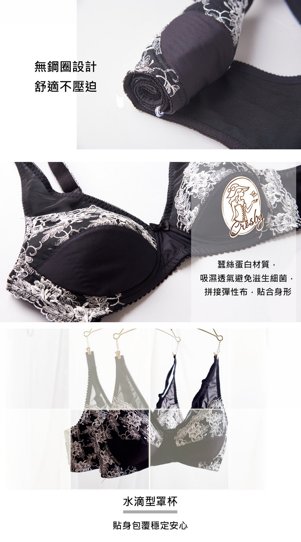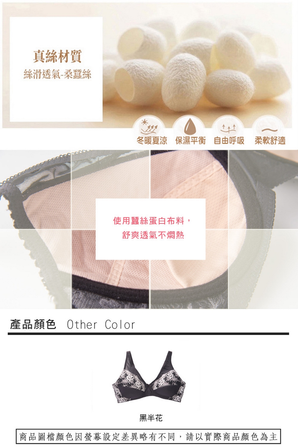1.內裡罩杯使用蠶絲蛋白布料,舒爽透氣不燜熱