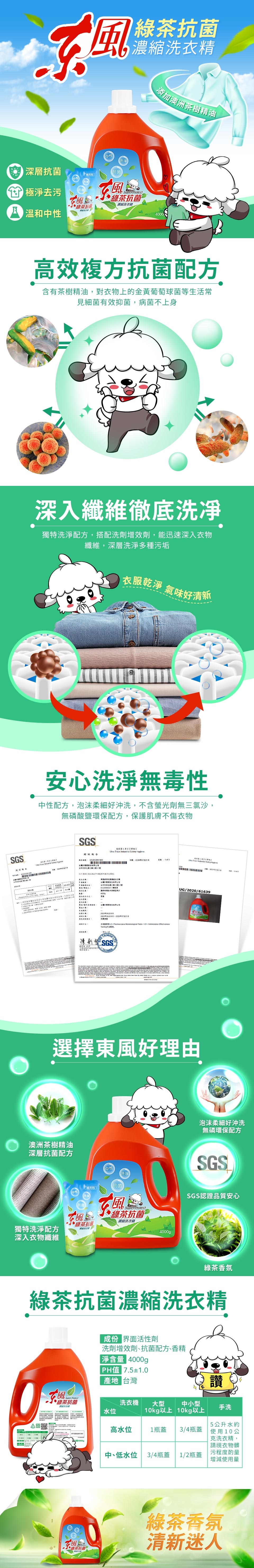 東風綠茶抗菌濃縮洗衣精使用高效複方抗菌劑,含有茶樹精油,有效抑菌衣物上的金黄葡萄球菌等生活常見細菌,讓衣物乾淨。