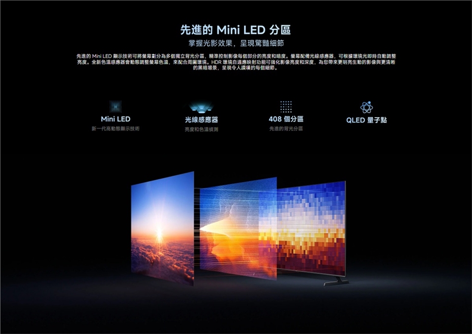 - 704 個分區的 QD-Mini LED 帶來強烈的對比與生動的細節