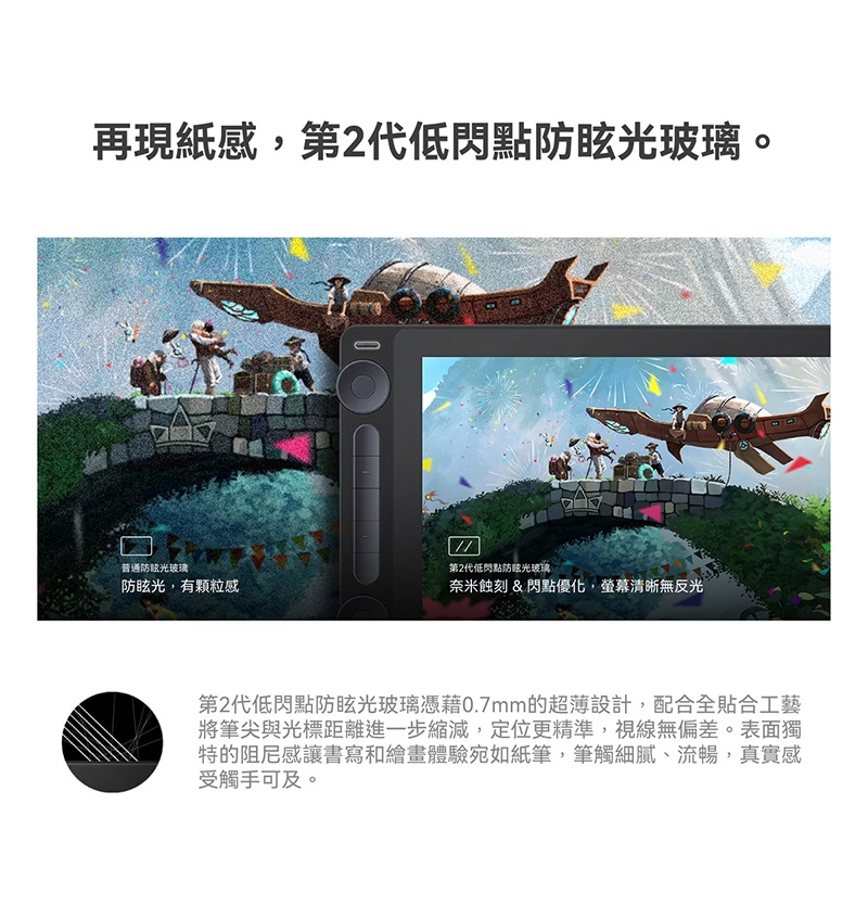 ● 螢幕全貼合技術,第二代低閃點防眩光玻璃