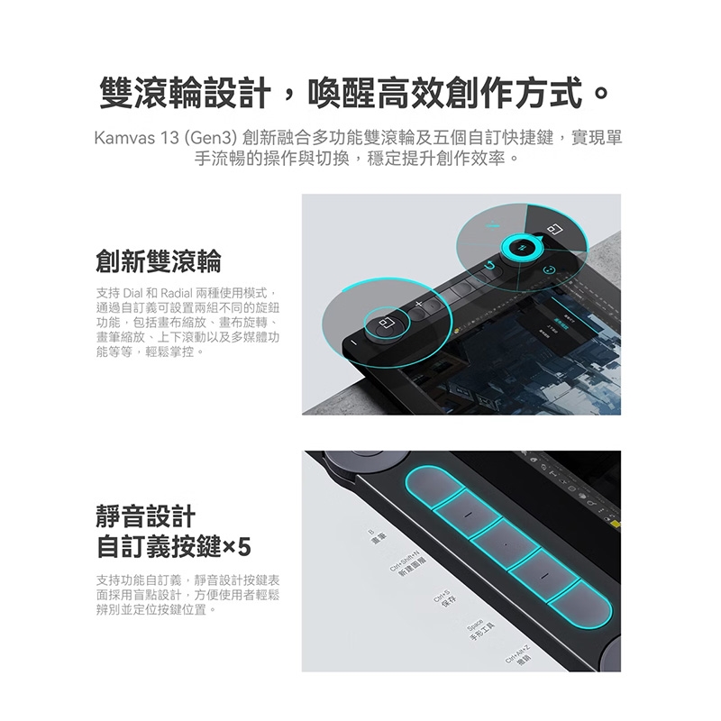 ● 多功能雙滾輪+5個自訂按鍵,提升創作效率