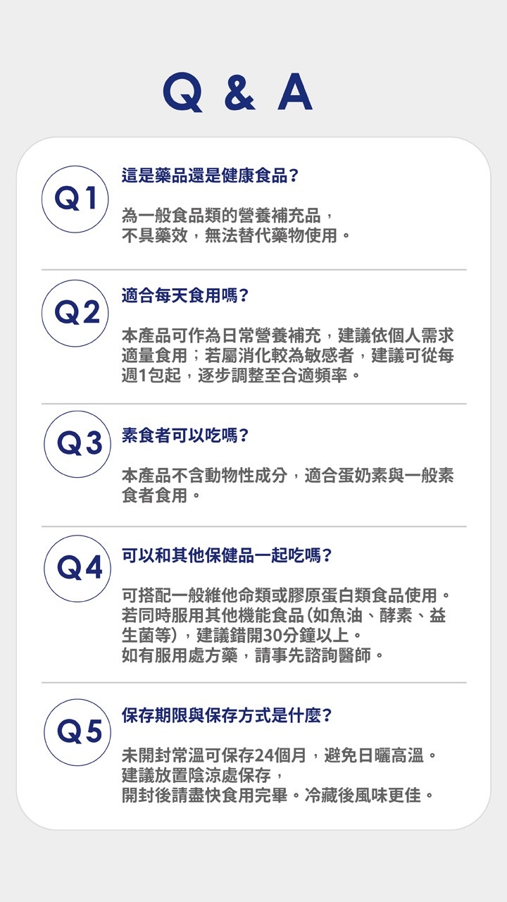 • 本產品為營養補充品,請依建議量食用,多食無益。