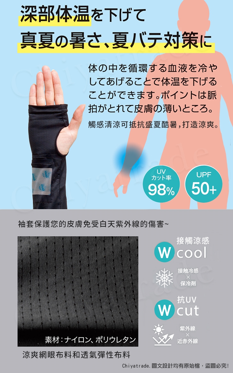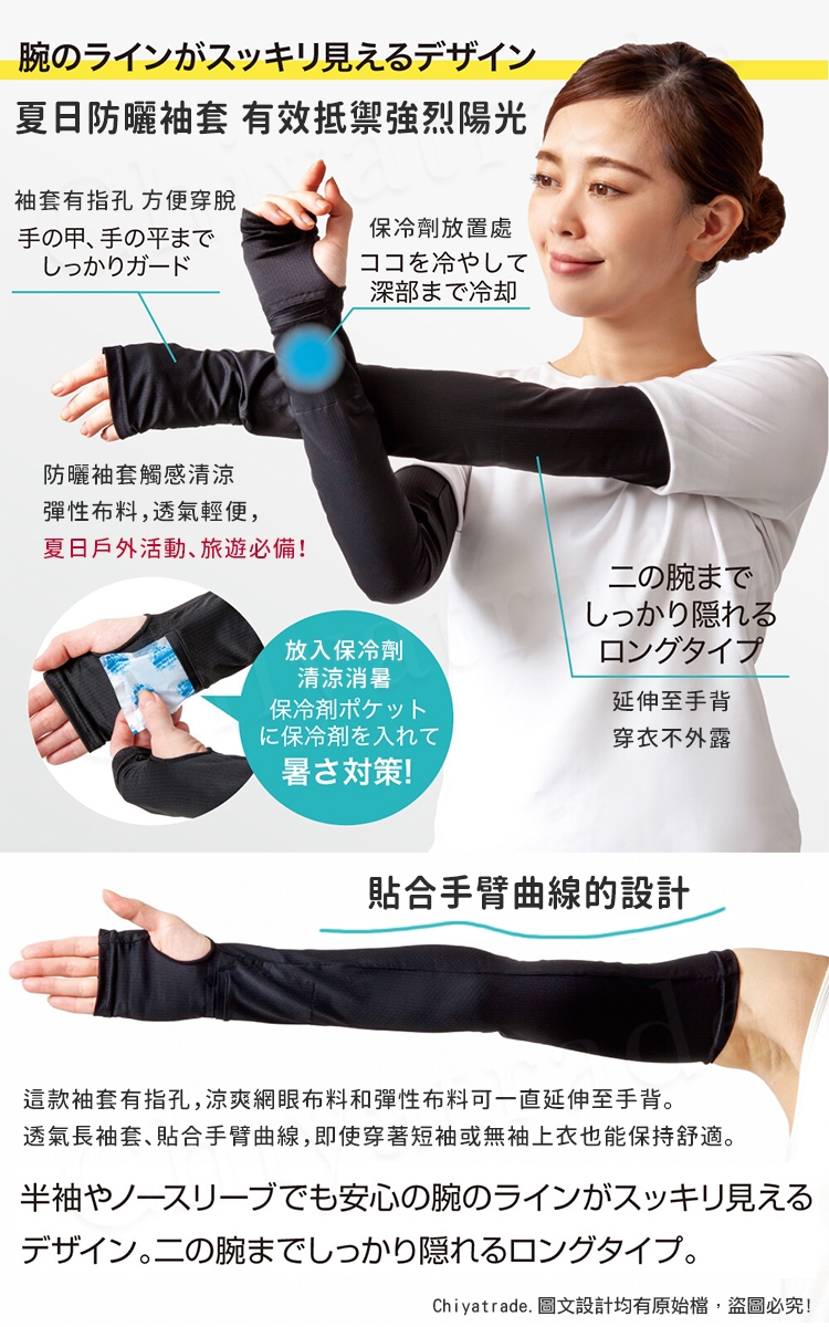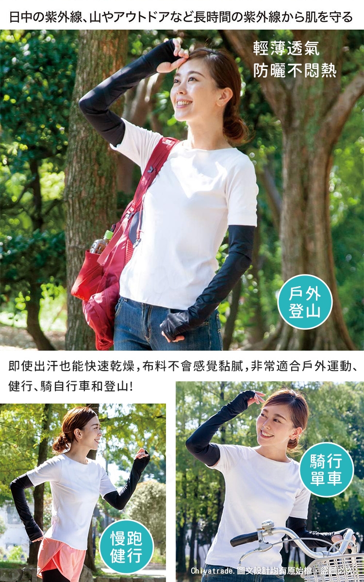 透氣長袖套、貼合手臂曲線的設計,即使穿著短袖或無袖上衣也能保持舒適。
