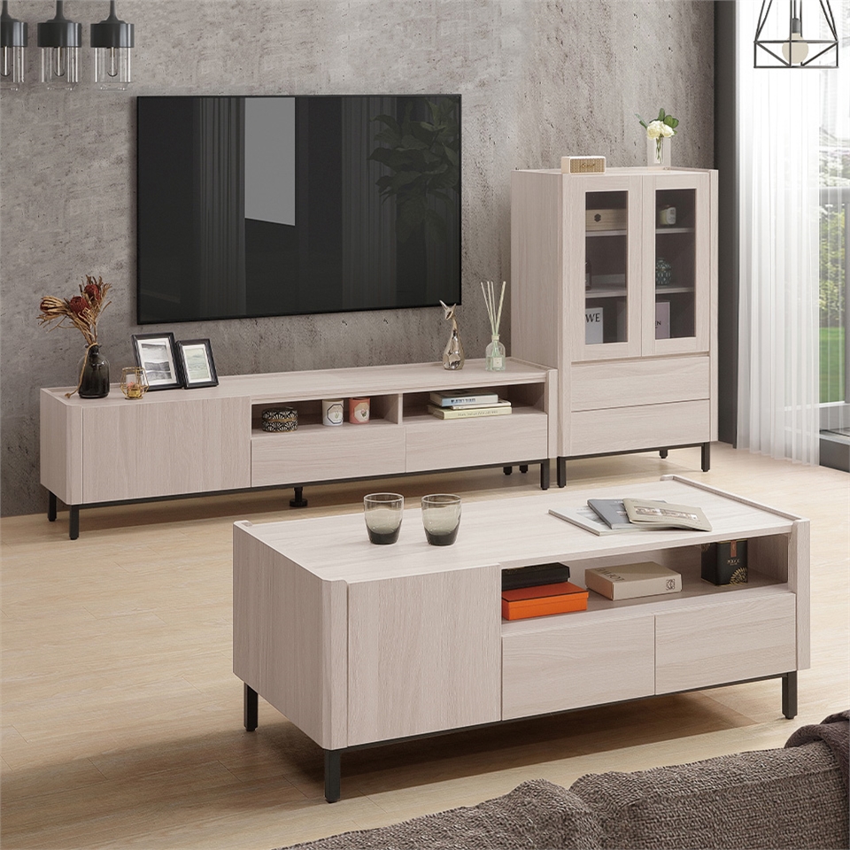 - 多樣化收納空間:結合隱藏式櫃體、開放空間與抽屜 三種收納方式,讓您能依照物品特性分類存放,使客廳保持整潔。