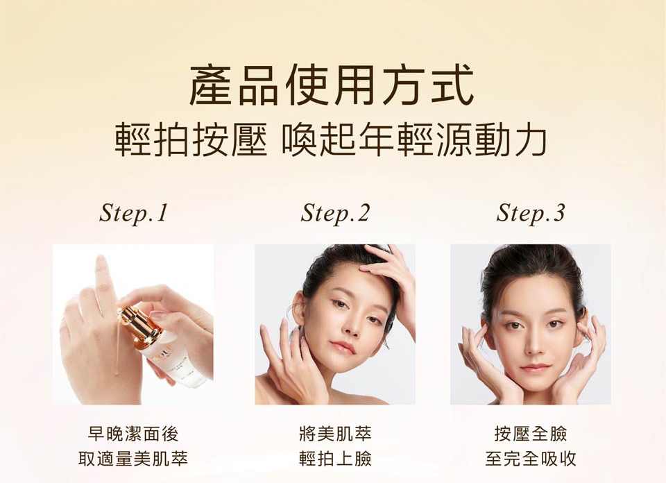 清潔臉部後,取適量美肌萃均勻塗抹於全臉肌膚,輕柔按摩至吸收。