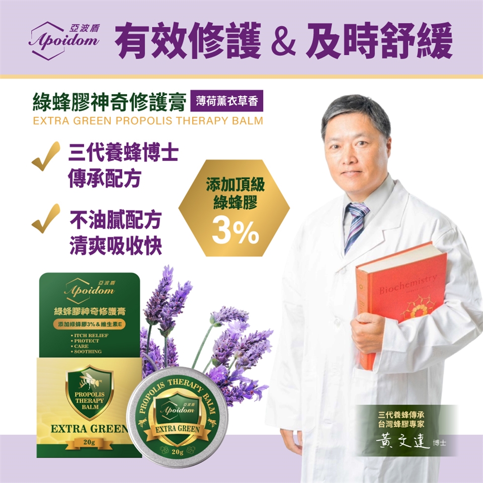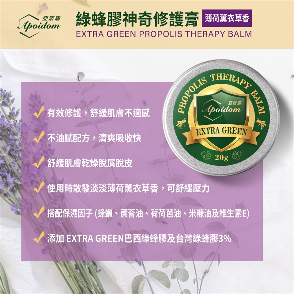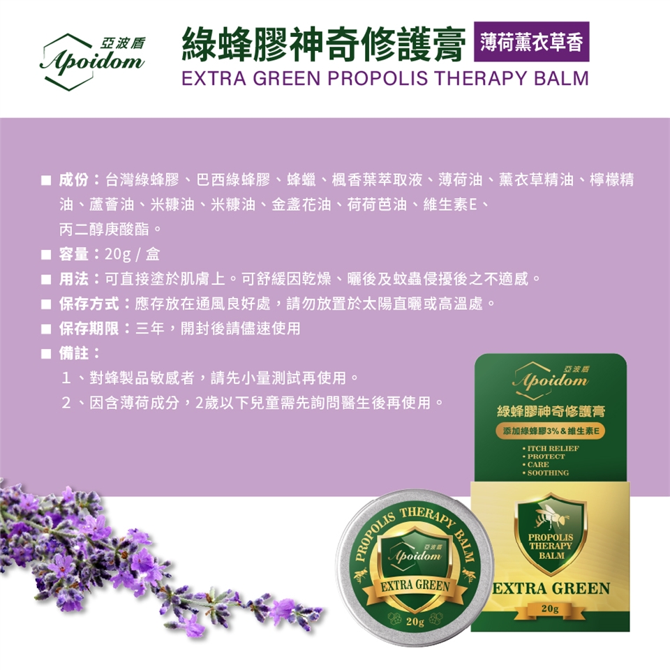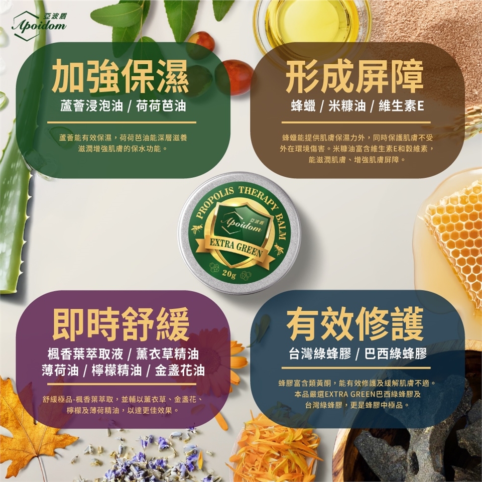 成 份:台灣綠蜂膠、巴西綠蜂膠、蜂蠟、楓香葉萃取液、薄荷油、薰衣草精油、檸檬精油、蘆薈浸泡油、米糠油、金盞花油、荷荷芭油、維生素E、丙二醇庚酸酯。