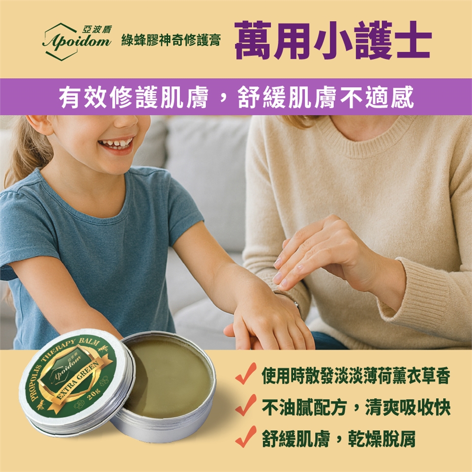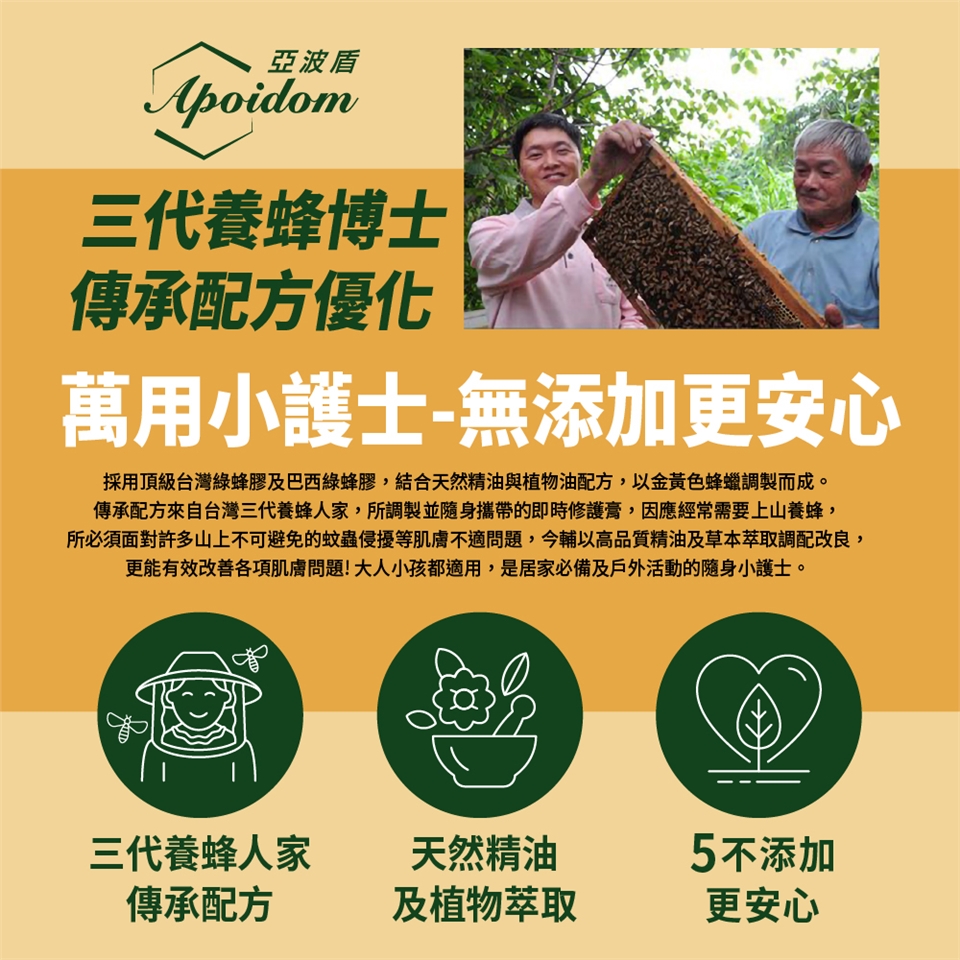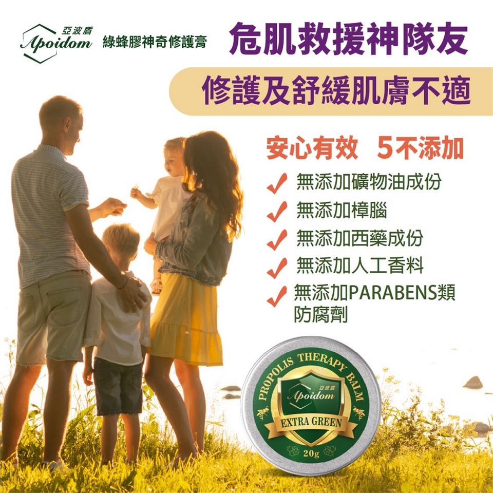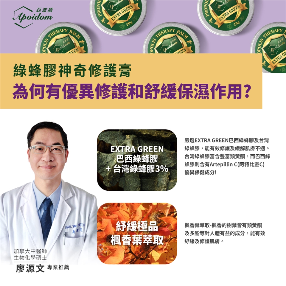 成 份:台灣綠蜂膠、巴西綠蜂膠、蜂蠟、楓香葉萃取液、薄荷油、薰衣草精油、檸檬精油、蘆薈浸泡油、米糠油、金盞花油、荷荷芭油、維生素E、丙二醇庚酸酯。