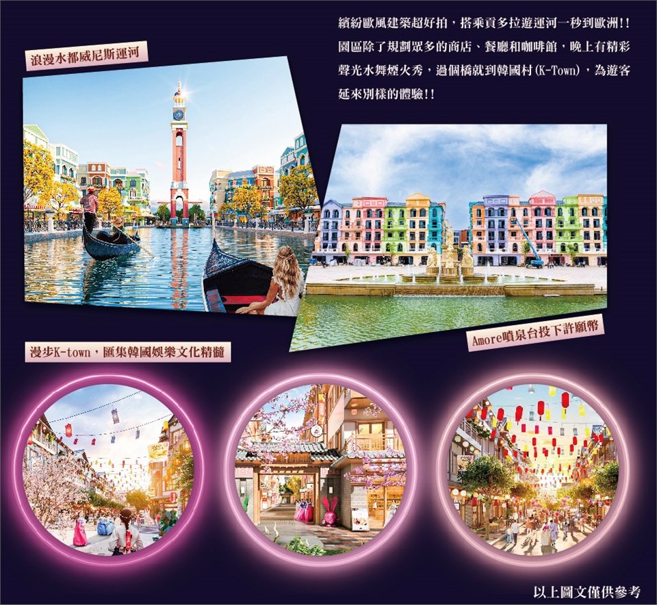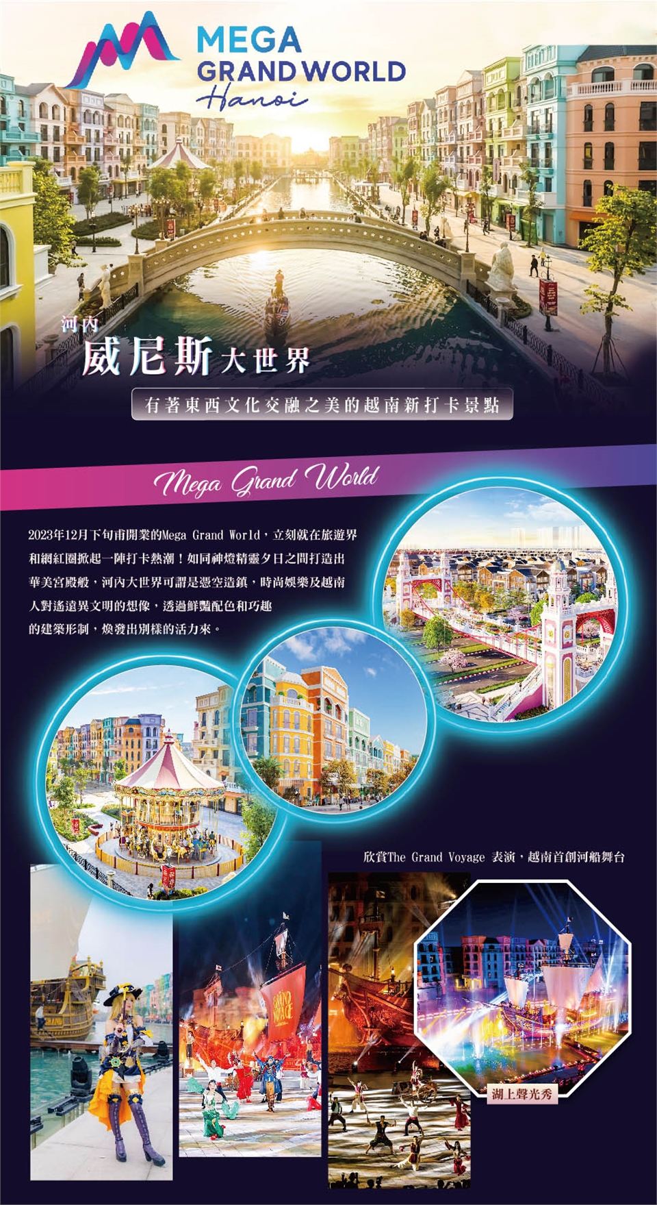 第一天 桃園/河內 (VIP 落地簽證) →打卡越南最新景點.2023全新開幕>河内威尼斯大世界Mega Grand World~浪漫水都威尼斯運河、Amore羅馬噴泉許願池、漫步韓國娛樂文化精髓K-town、湖上聲光秀The Grand Voyage |